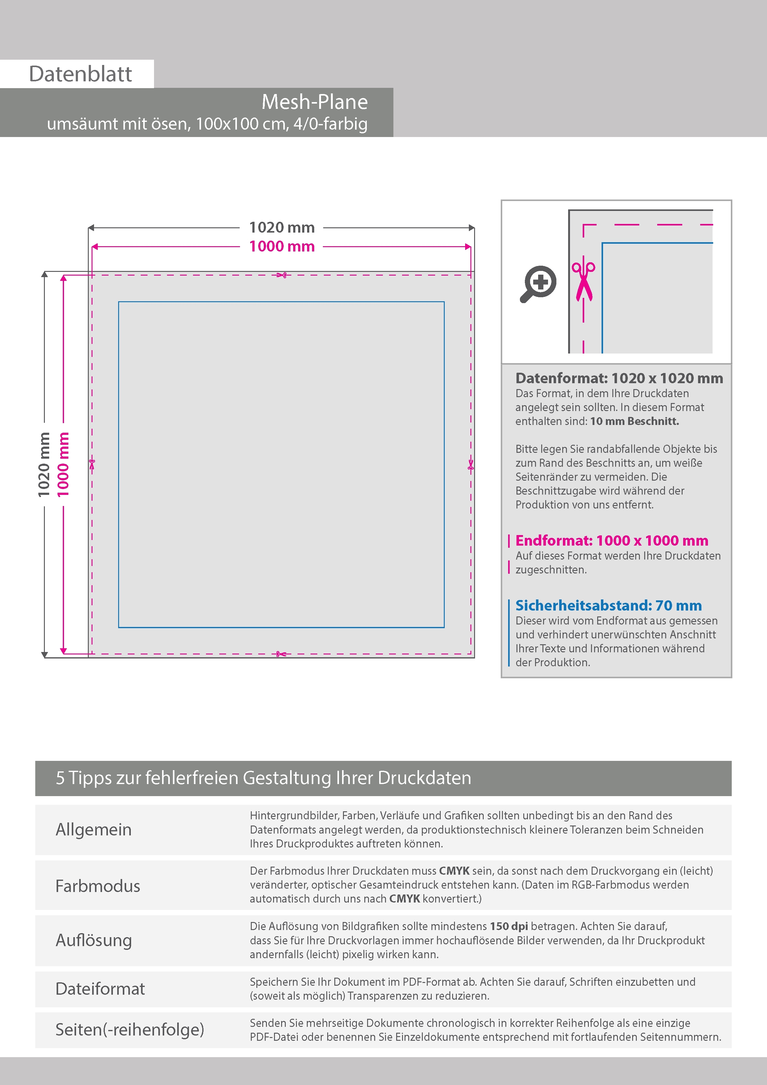 Hochwertige Mesh-Plane 100 x 100 cm, 4/0-farbig bedruckt, Umsäumt + Ösen im Abstand von 50 cm oben und unten