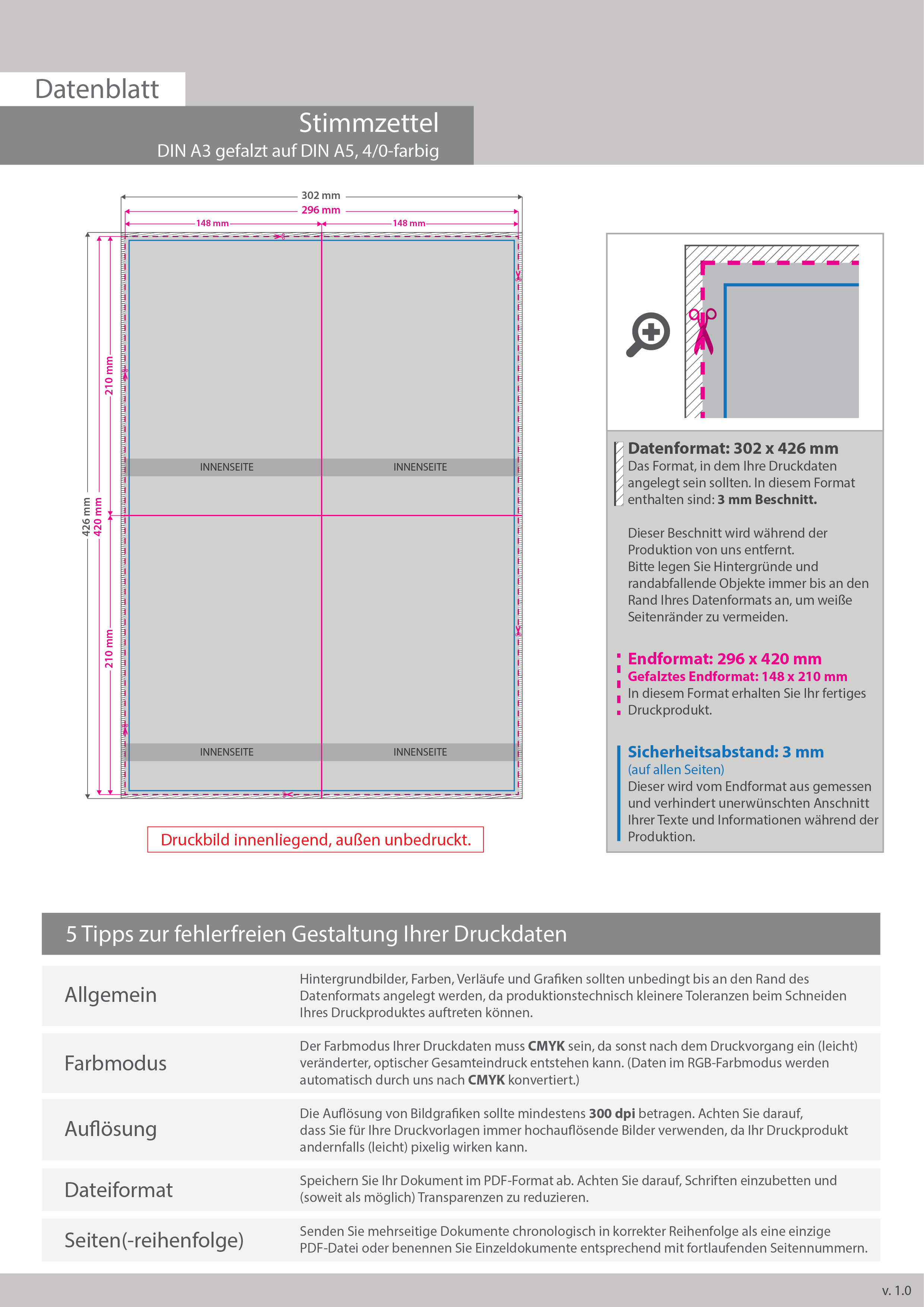 Stimmzettel DIN A3 gefalzt auf DIN A5, 4/0-farbig CMYK (einseitig bedruckt)