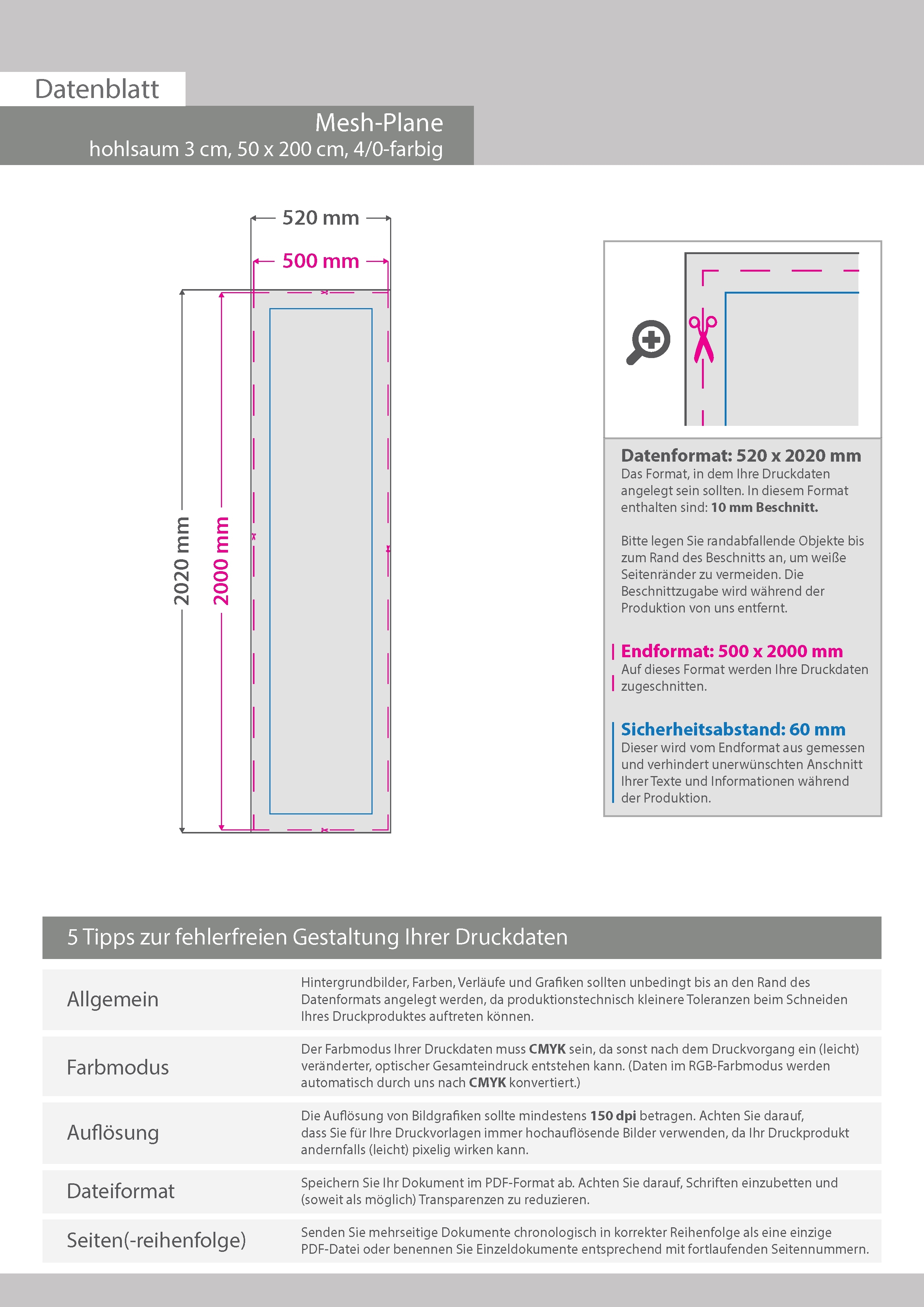 Hochwertige Mesh-Plane (PVC-frei), 50 x 200 cm, 4/0-farbig bedruckt, Hohlsaum oben und unten (Durchmesser Hohlsaum 3,0 cm)