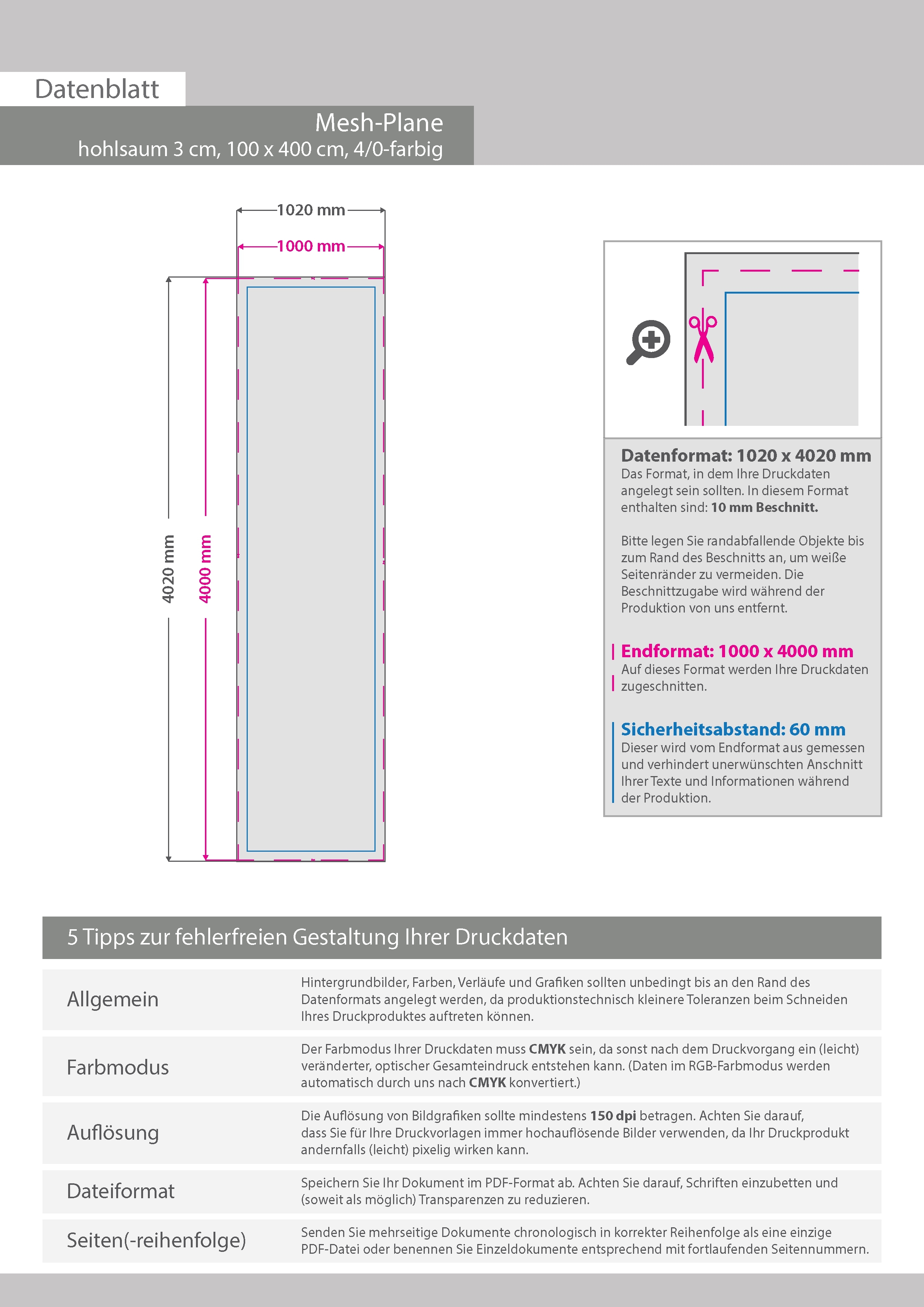 Hochwertige Mesh-Plane (PVC-frei), 100 x 400 cm, 4/0-farbig bedruckt, Hohlsaum oben und unten (Durchmesser Hohlsaum 3,0 cm)