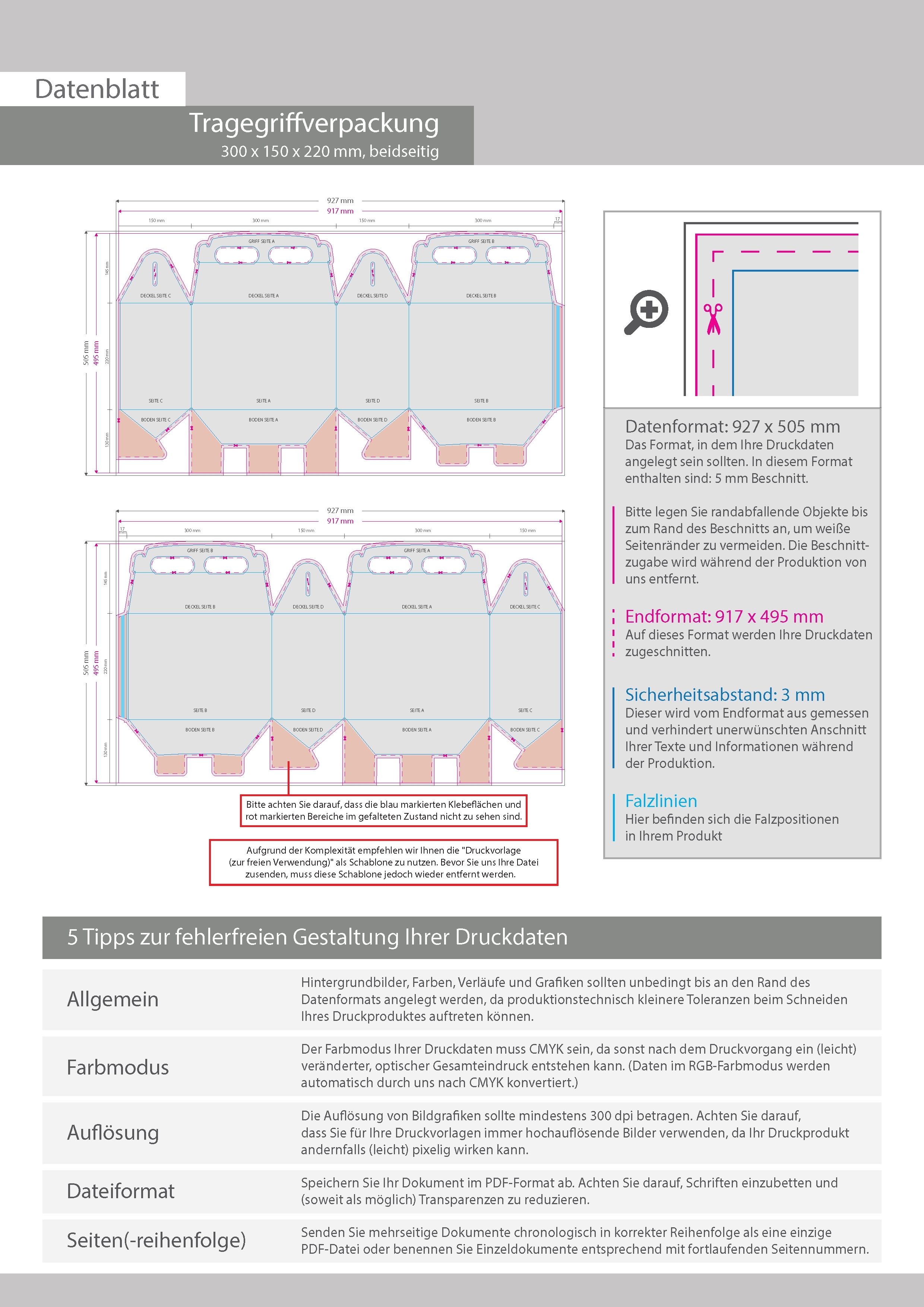 Tragegriffverpackung (30 cm x 15 cm x 22 cm) beidseitig bedruckt 5/4-farbig (CMYK + Sonderfarbe)